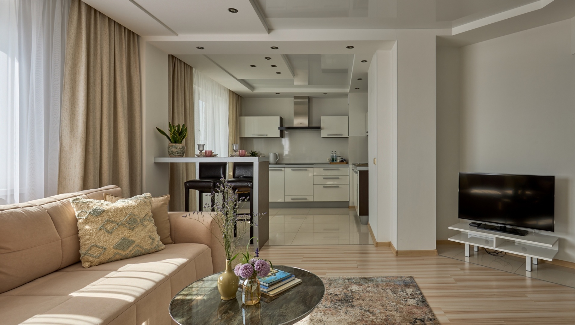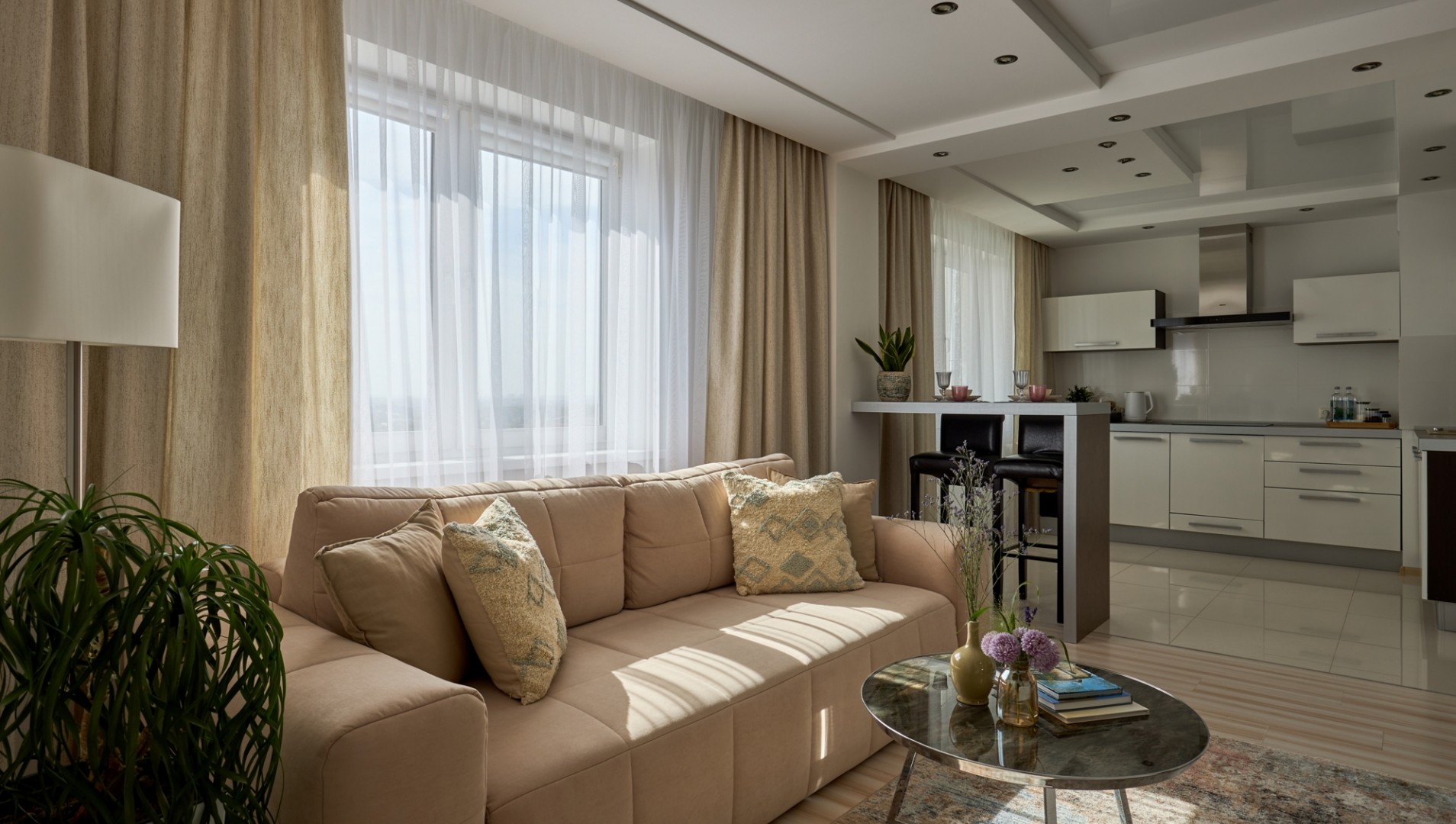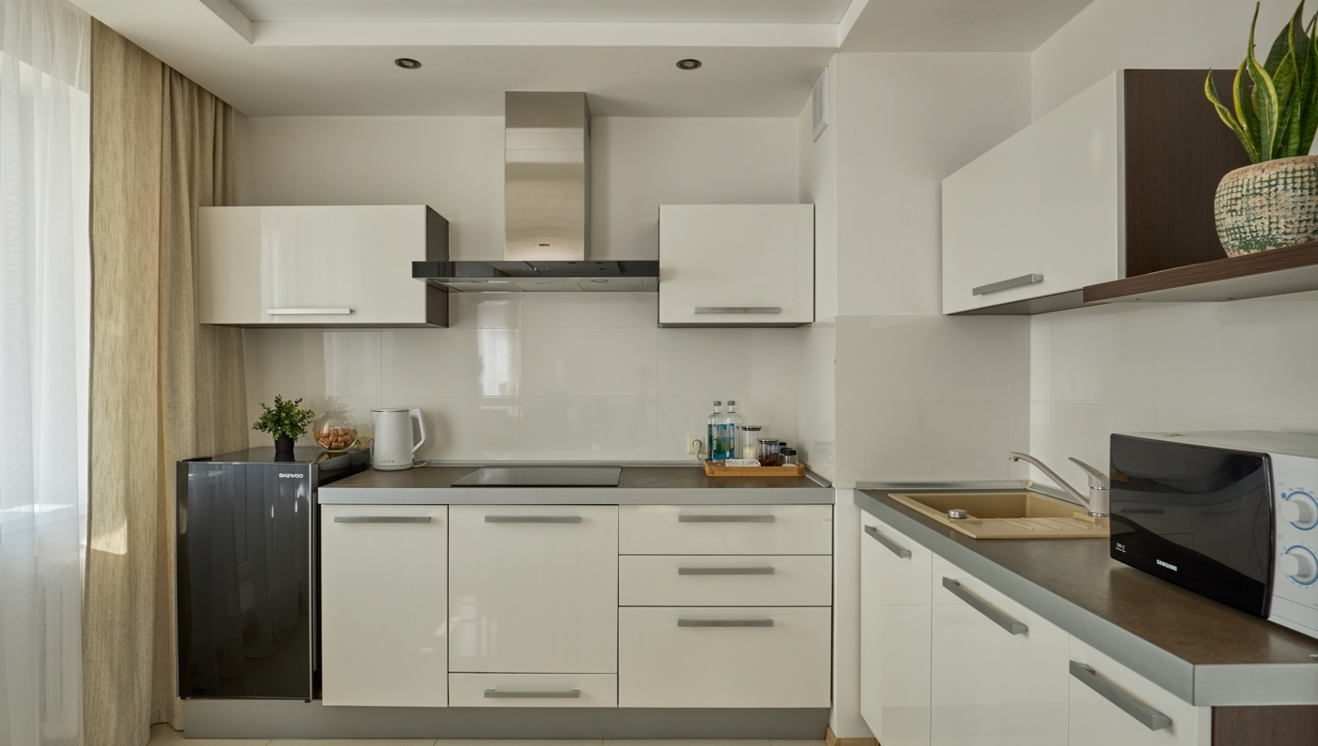 This elite one-room apartment is located in a new house on the 10th floor. From the window of this wonderful apartment is opened a beautiful panoramic view. The house is situated not far from the historical centre of the town. This is a new region is fully secured the necessary infrastructure. Near the house there is a paid-parking area, twenty-four-hour shop, trade center, chemistry. The modern apartment for wonderful rest. It’s become a favorites place to stay in.