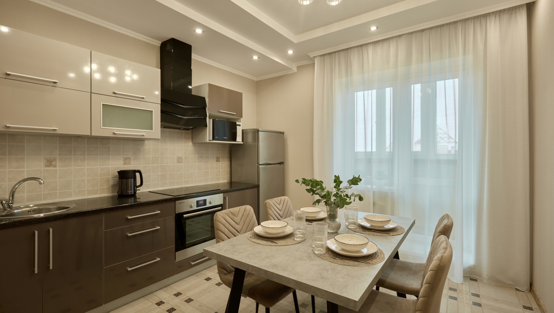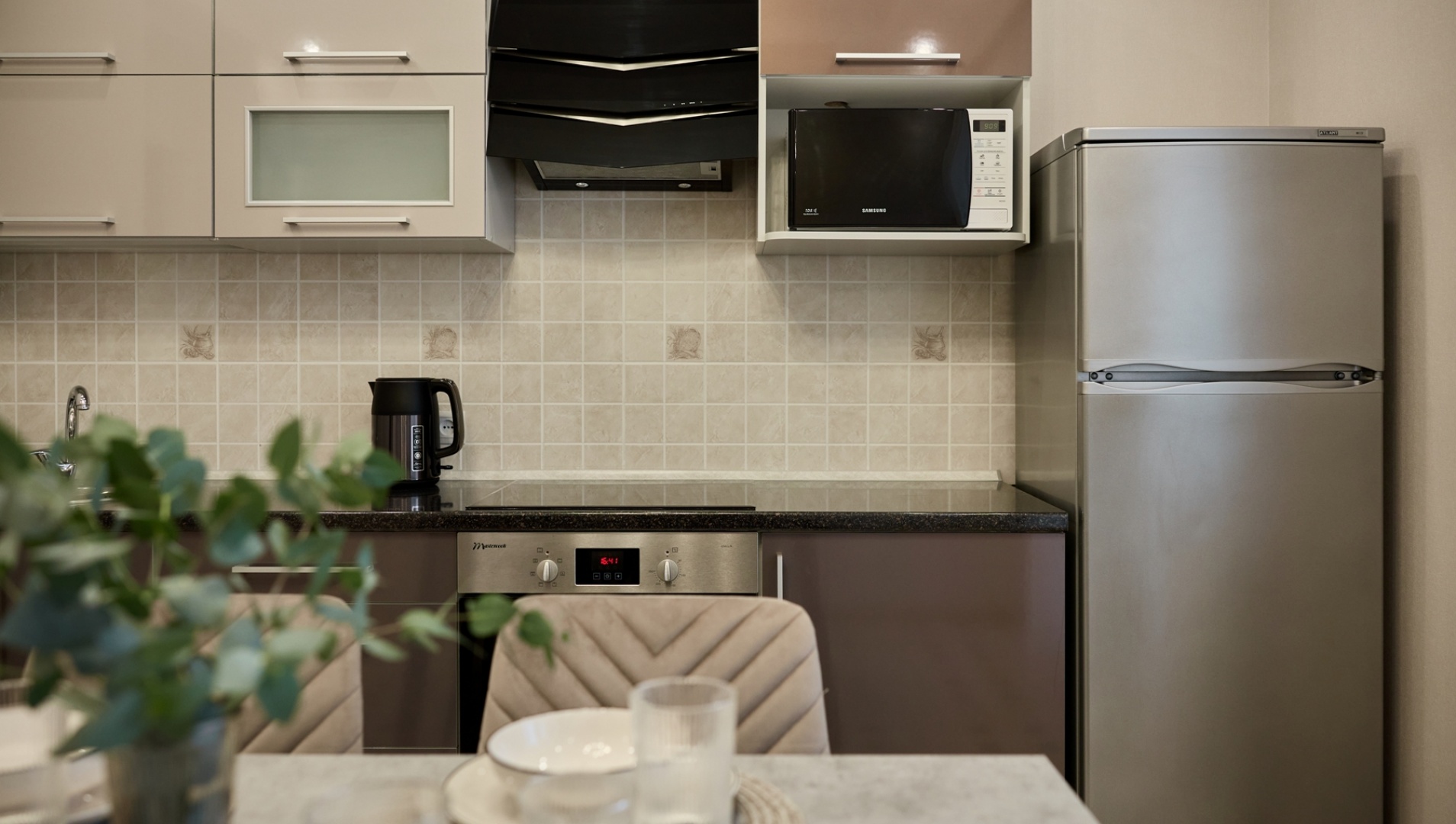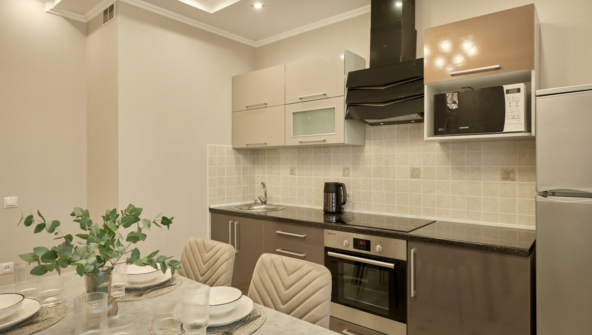 The apartment is located in a 19-storeys new house at a height of 11th floor. The house is built in a convenient location: on the one hand extends the protected forest and the river, and on the other bustling city life. The most demanding guests will be satisfied with the beauty and convenience of the apartment and the area where it is located. A forested area will appeal to nature lovers and cinemas, restaurants and nightclubs will attract those who like the urban entertainment. Modern and stylish apartment in an excellent area will attract the attention of guests and will leave the most pleasant impressions.