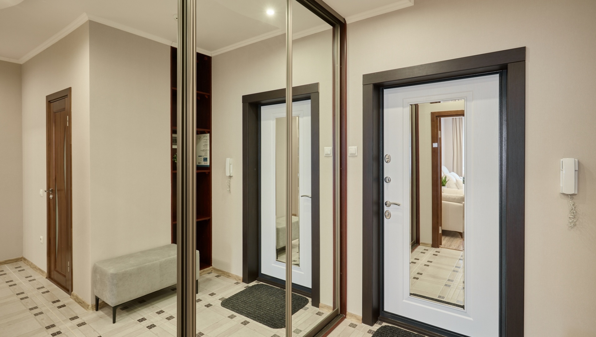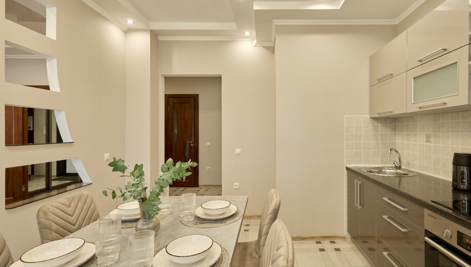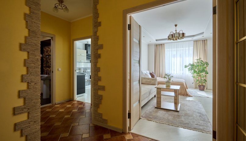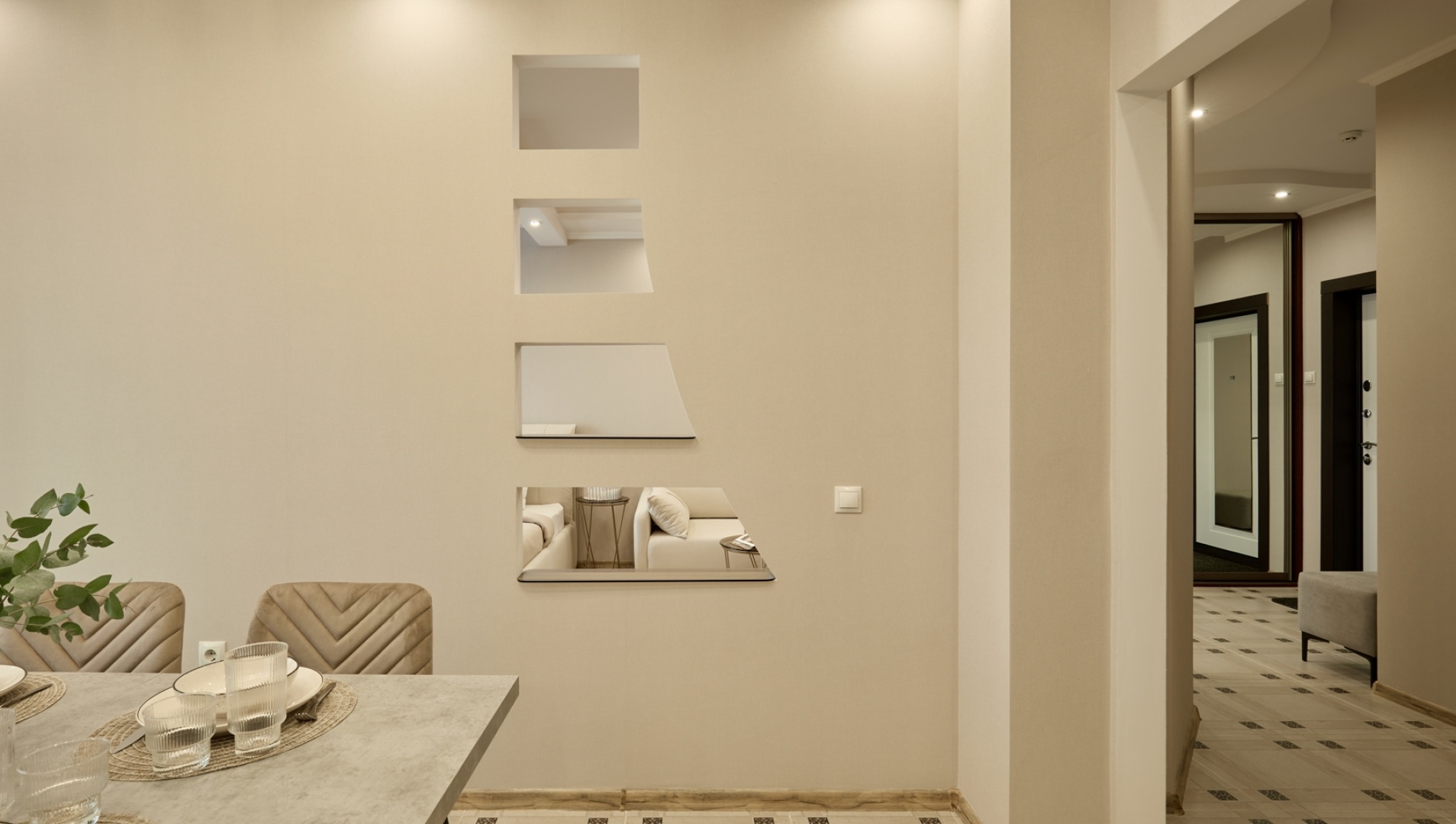 The apartment is located in a 19-storeys new house at a height of 11th floor. The house is built in a convenient location: on the one hand extends the protected forest and the river, and on the other bustling city life. The most demanding guests will be satisfied with the beauty and convenience of the apartment and the area where it is located. A forested area will appeal to nature lovers and cinemas, restaurants and nightclubs will attract those who like the urban entertainment. Modern and stylish apartment in an excellent area will attract the attention of guests and will leave the most pleasant impressions.
