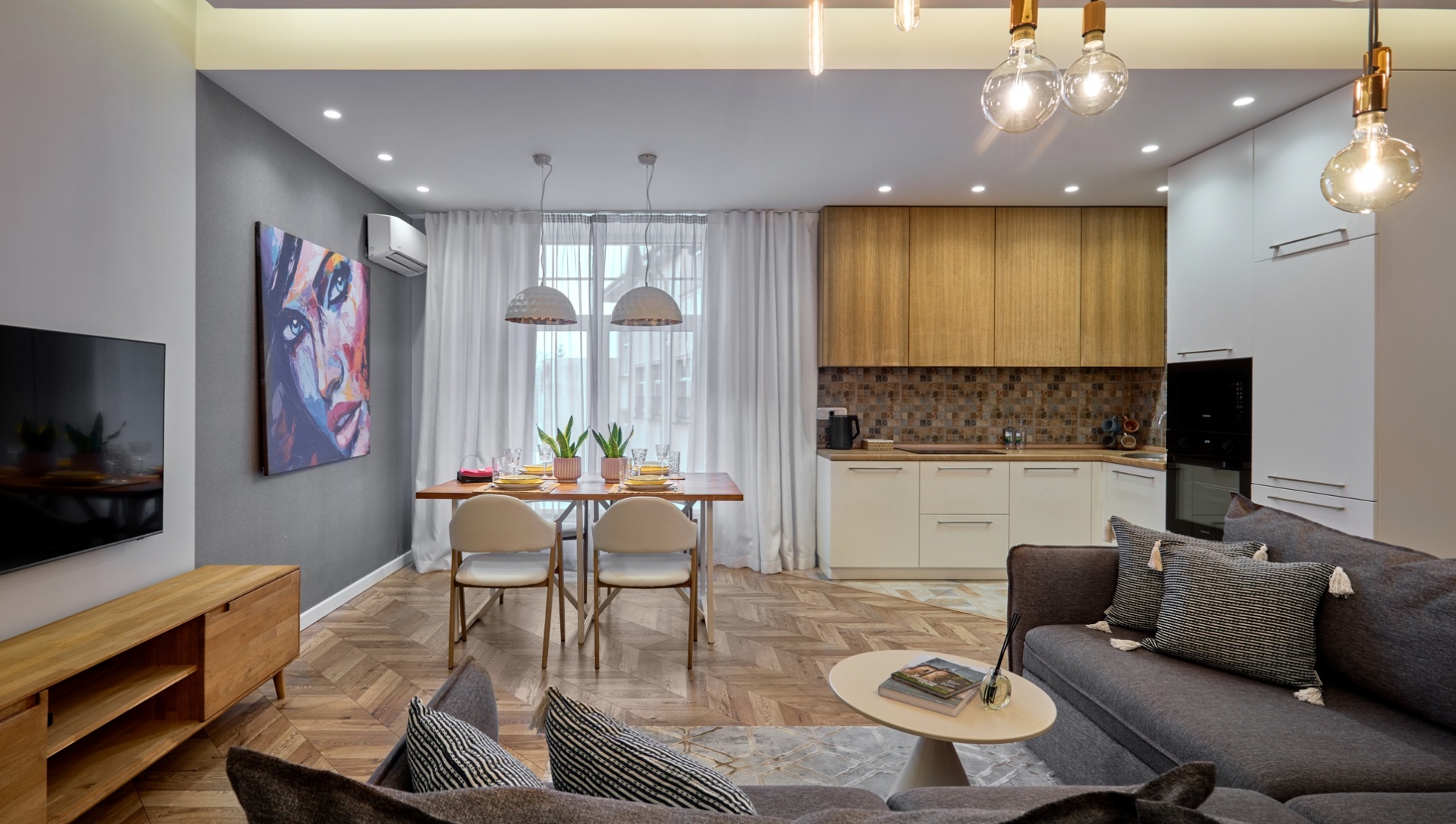 The apartment is equipped with all necessary household appliances, climate control system, 2 LCD TVs, wireless Internet, dishes, bedding, towels, disposable cosmetics, tea, coffee and other small things we took care of, so that your stay with us was as comfortable as possible !!