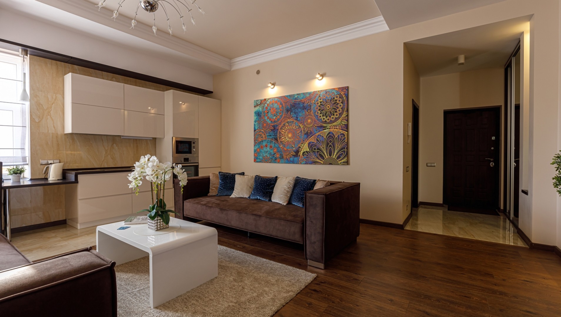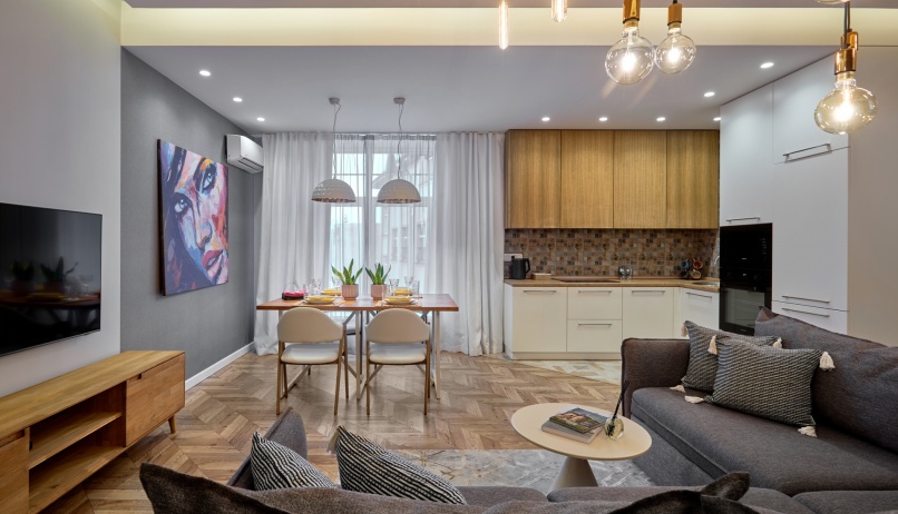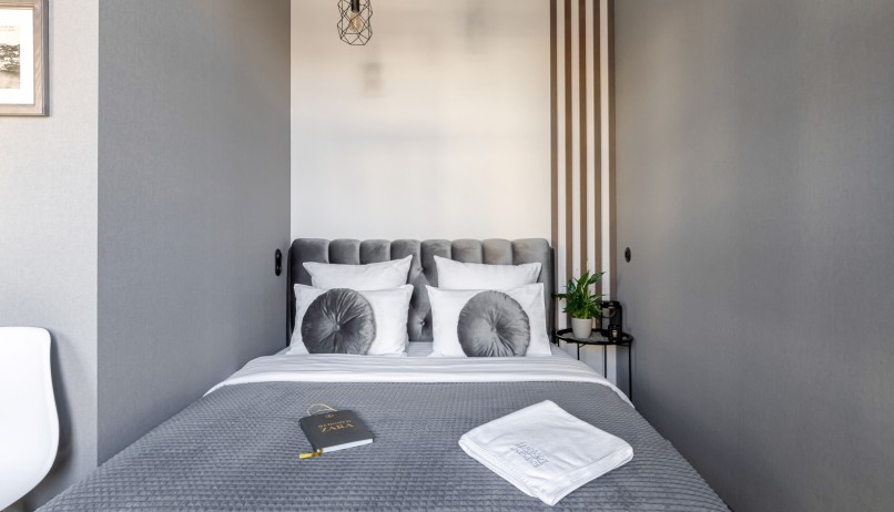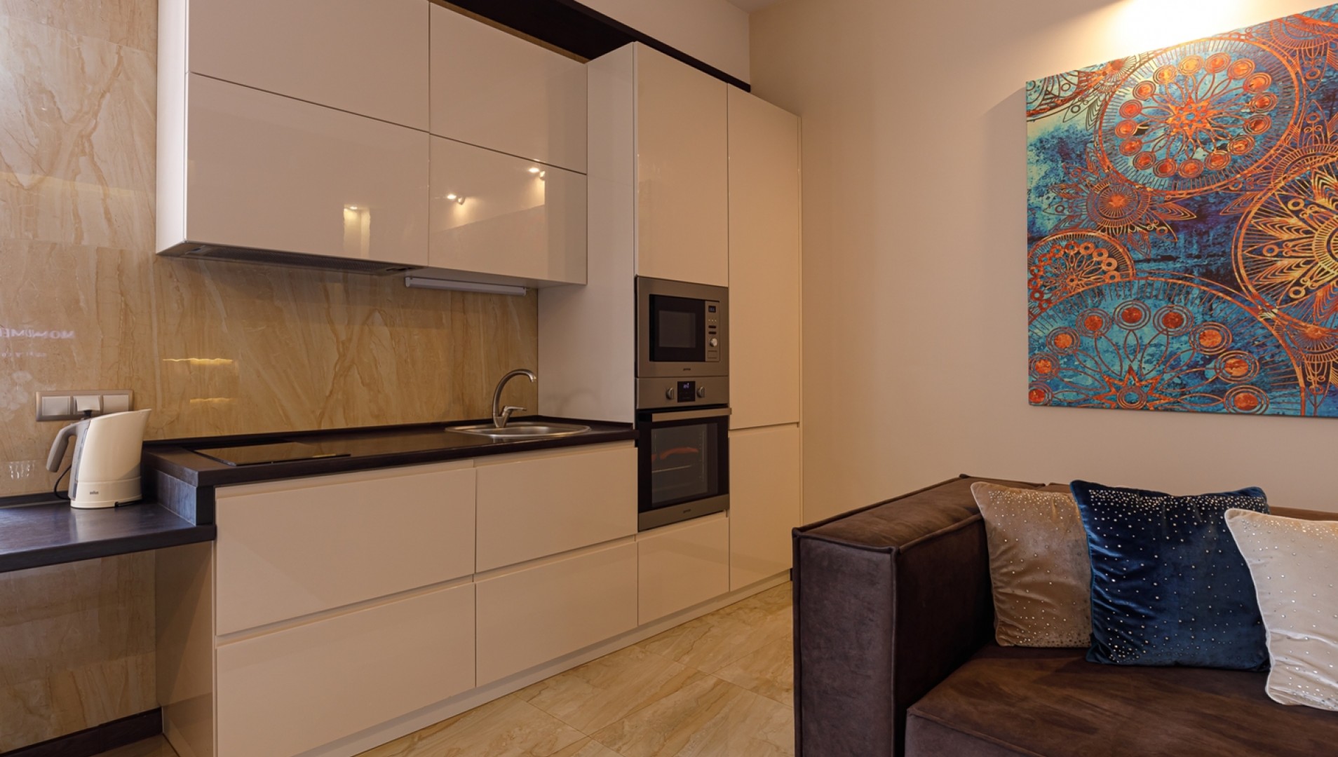 Luxury one bedroom apartment in the center of Grodno. Located on the second floor of a four-storey brick building. The apartment has modern designer renovation and redevelopment of space. Living room with open kitchen; adjacent is an adjacent bedroom with a Queen size bed; spacious bath equipped with Jacuzzi and shower cabin.