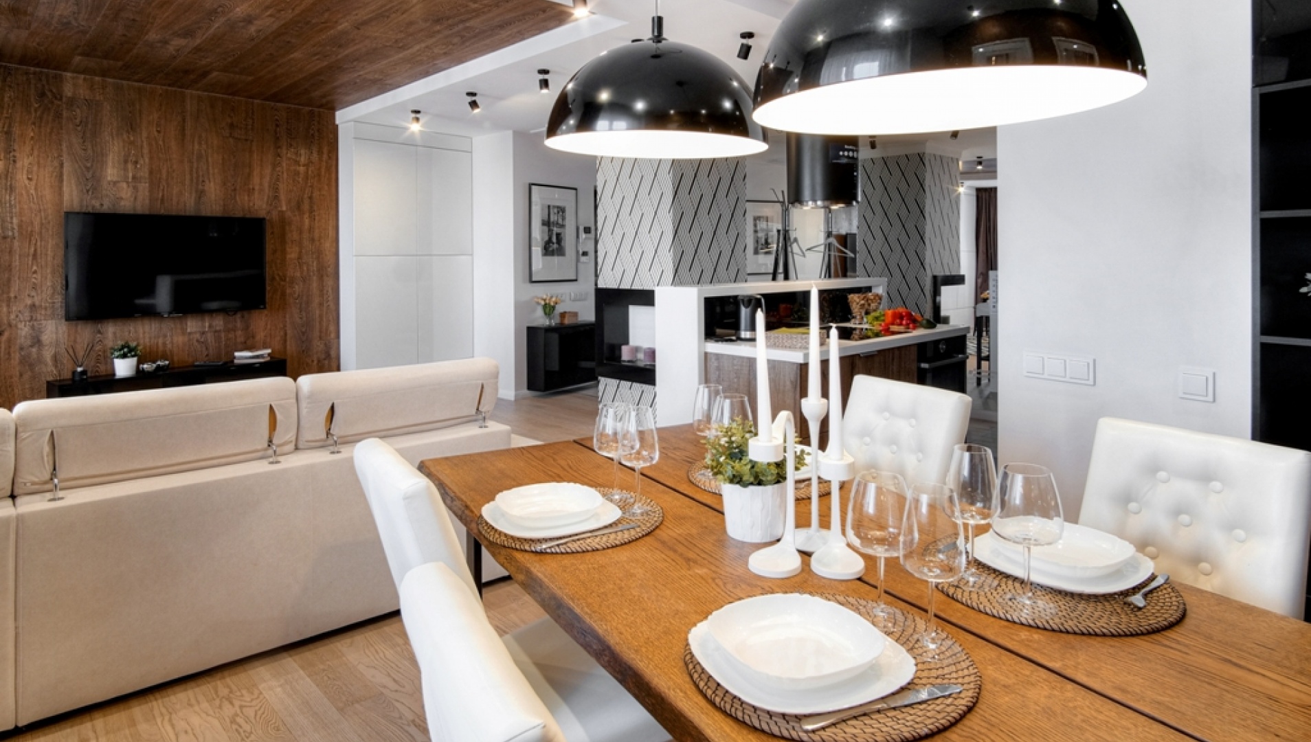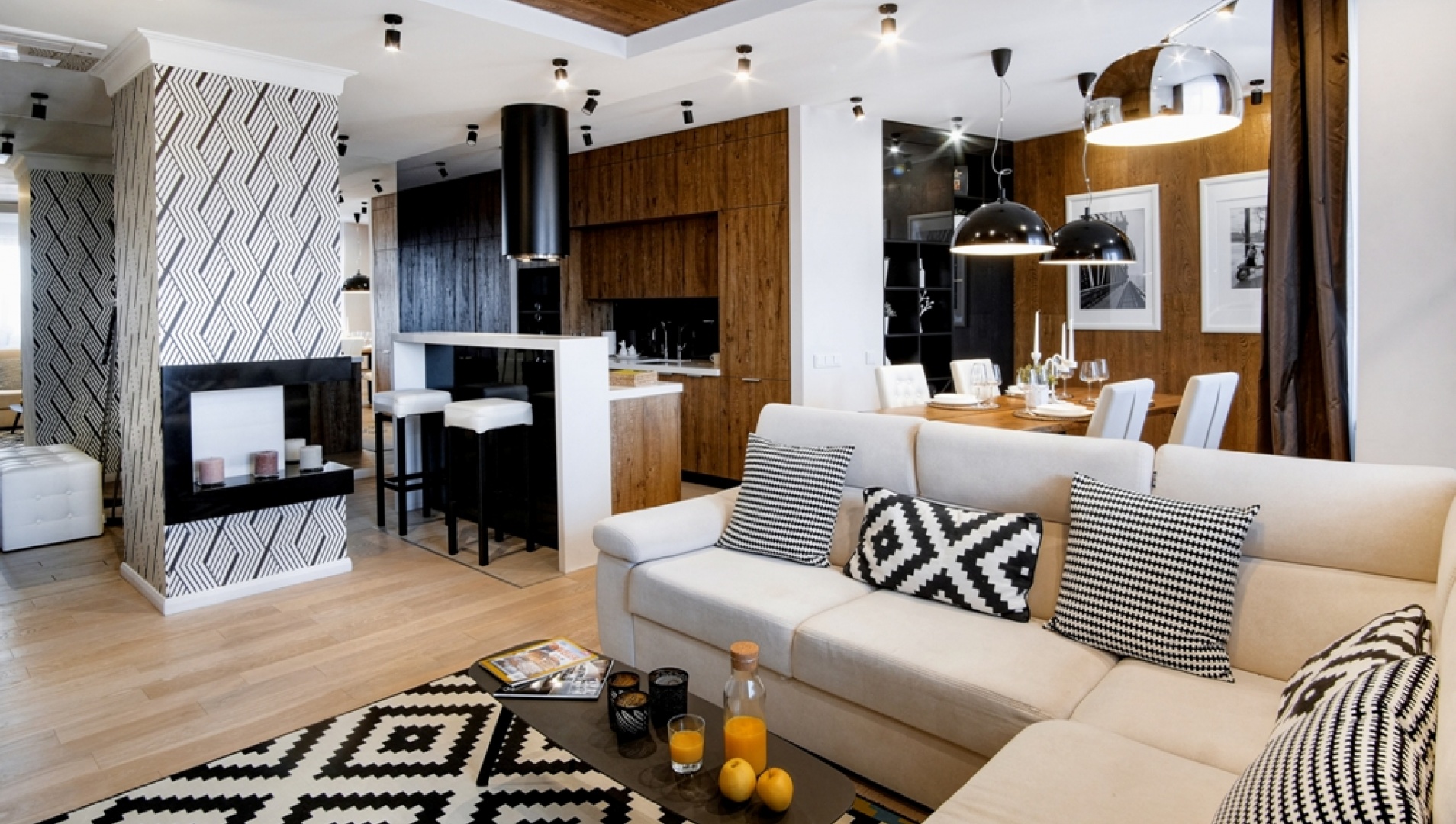 За массивной металлической дверью гости наслаждаются поистине чудесной картиной. Светлая квартира с открытой планировкой. Хорошо продуманы необходимые функциональные зоны: прихожая, гостиная, столовая, кухня и даже камин!