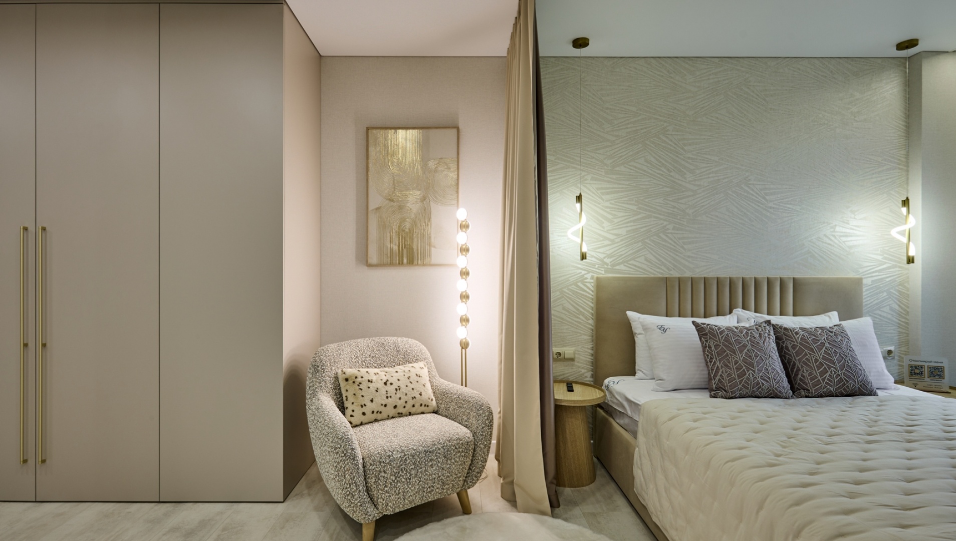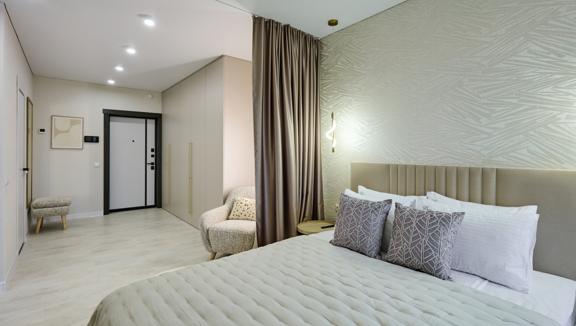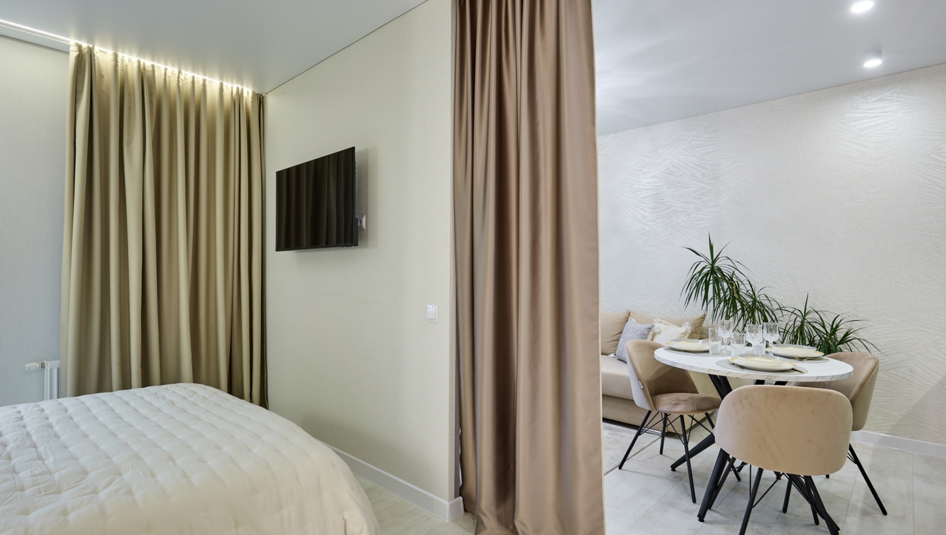 Mieszkanie-studium, urządzone w modnym czarno-fioletowym kolorze, przykuje uwagę współczesnych i niebanalnych ludzi. Otwarta przestrzeń została umiejętnie podzielona na strefę kuchni i sypialni.