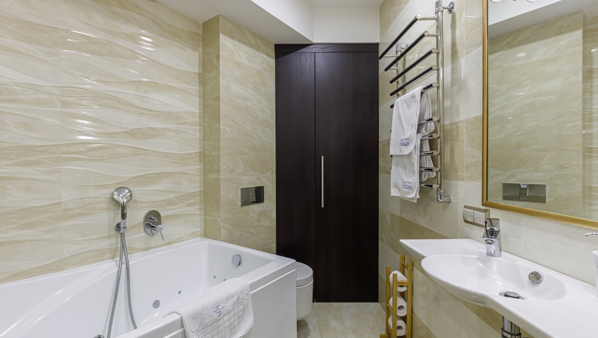 Luksusowy dwupokojowy apartament w centrum Grodna znajduje się na drugim piętrze czteropokojowego domu z cegły. W apartamentach zrobiono remont designerski z przeplanowaniem przestrzeni. Pokój gościnny połączony z kuchnią; do nich przylega sypialnia z dużym dwuosobowym łóżkiem; przestronna łazienka jest wyposażona w jacuzzi i kabinę prysznicową.